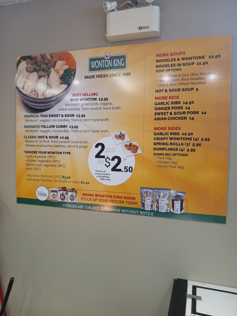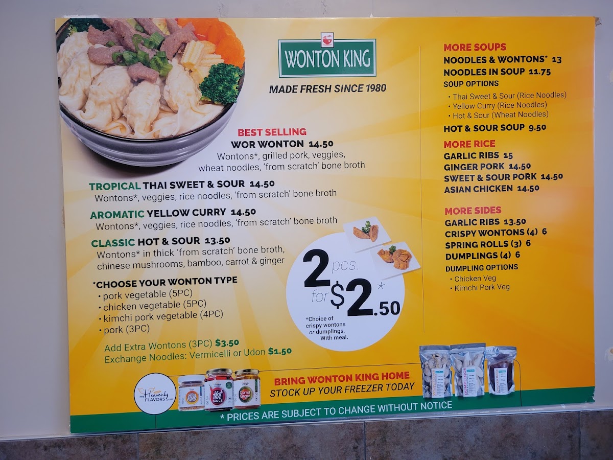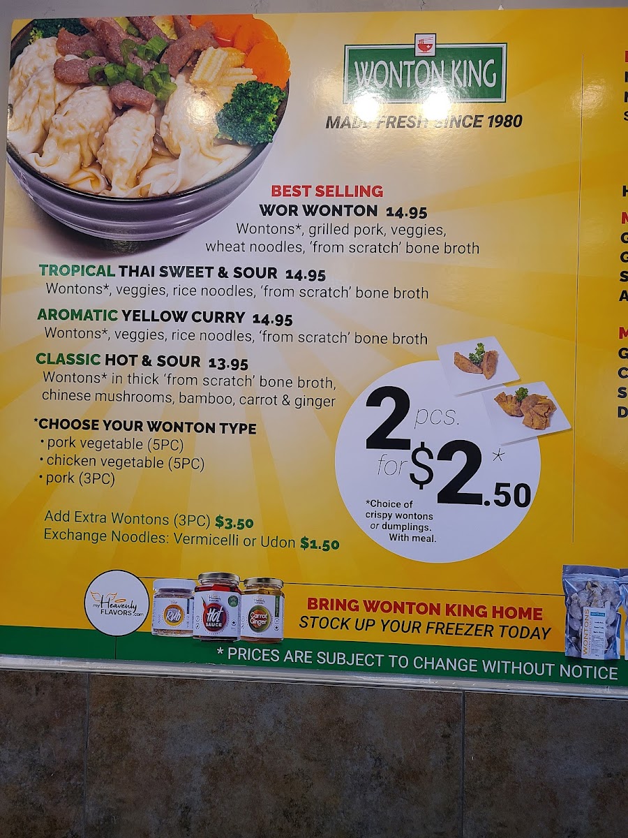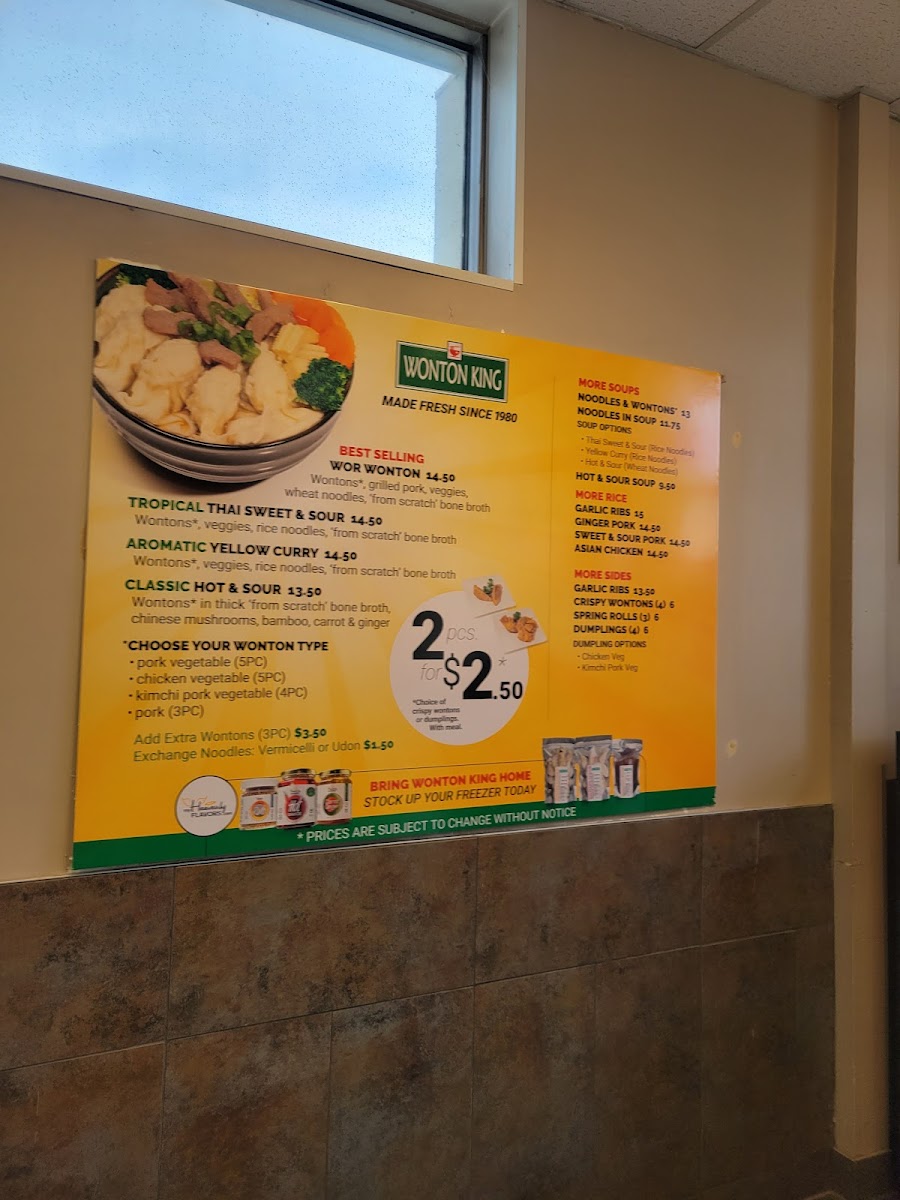 Welcome to Wonton King - McCall Lake (North), where we invite you to embark on a culinary adventure that celebrates the delightful flavors of traditional wonton cuisine! Located at 3449 12 St NE, Calgary, AB T2E 6S6, our menu is a feast for the senses, featuring a range of mouthwatering dishes that promise to satisfy your cravings. Indulge in our signature Wonton Only Soup with six delectable pieces or dive into the rich and flavorful Pork Wonton Noodle Soup, perfect for a comforting meal. For those seeking a twist, our Kimchi Vegetable Wonton Noodle Soup offers a zesty kick, while the Chicken Vegetable Wonton Noodle Soup is a delightful option for poultry lovers. With a variety of Health & Safety Soups, each packed with your choice of wontons, you're sure to find something that tantalizes your taste buds. Don’t forget to quench your thirst with our refreshing beverages! Join us at Wonton King and taste the specialties that keep our customers coming back for more!